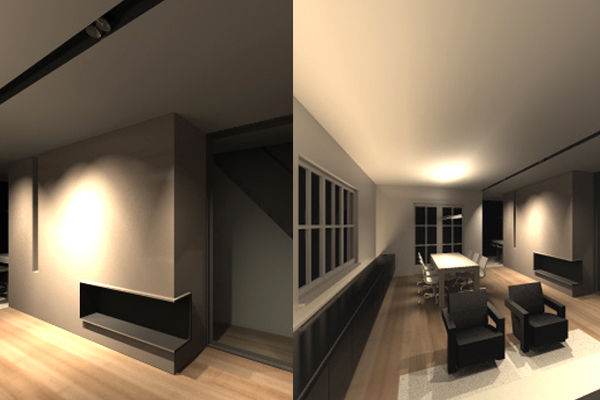 | In dit ontwerp werd het volledige interieur van een bestaande halfopen bebouwing opnieuw ingericht. Een wandkast waarin o.a. de vestiaire en de haard zijn verwerkt organizeert het gelijkvloers. De verdieping werd opgevat als een luxueuze hotelsuite waarin een masterbedroom gekoppeld is aan een inloopressing en een ruime badkamer. | ![]() |