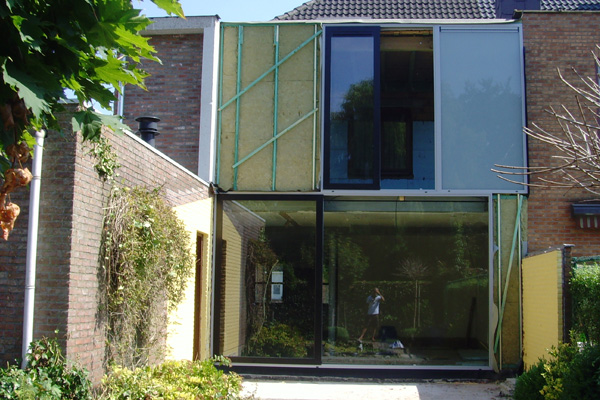 | De opdracht bestond erin, om de bestaande leefruimte waar slechts nauwelijk natuurlijk daglicht binnenviel, om te toveren tot een grote open ruimte met veel licht en veel contact met de tuin. Dit resulteert in het openwerken van de gelijkvloers en het verwijderen van alle binnenmuren. Op de verdieping wordt er achteraan een slaapgedeelte bijgebouwd. Deze masterbedroom met privé badkamer werd als een ‘hotelsuite’ ontworpen en ingericht. | ![]() |